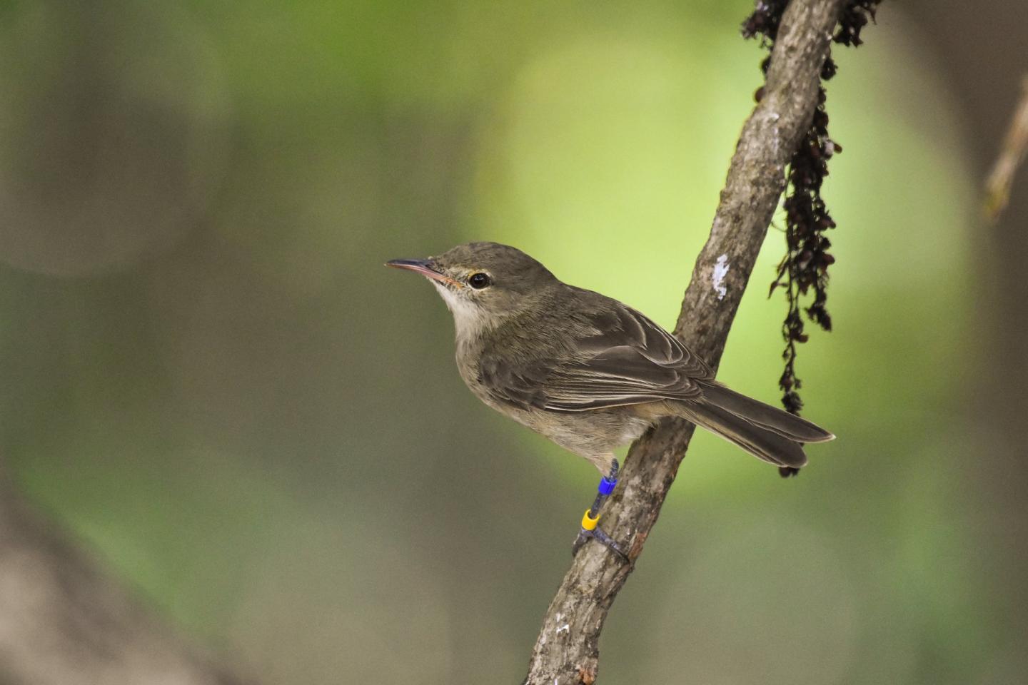 image: This is a Seychelles warbler wearing colored rings for identification