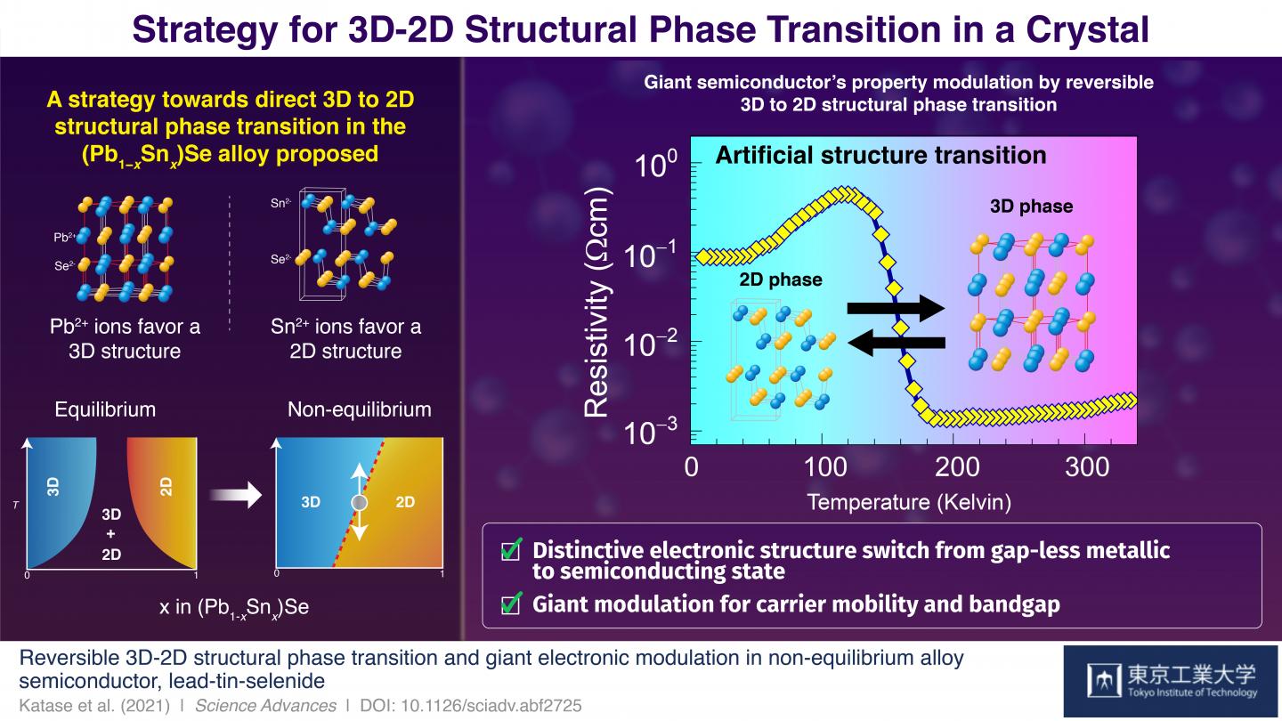 The electronic properties of solid materials are highly dependent on crystal structures and their dimensionalities (i.e., whether the crystals have predominantly 2D or 3D structures). As Professor Takayoshi Katase of Tokyo Institute of Technology notes, this fact has an important corollary: "If the crystal structure dimensionality can be switched reversibly in the same material, a drastic property change may be controllable." This insight led Prof. Katase and his research team at Tokyo Institute of Technology, in partnership with collaborators at Osaka University and National Institute for Materials Science, to embark on research into the possibility of switching the crystal structure dimensionality of a lead-tin-selenide alloy semiconductor. Their results appear in a paper published in a recent issue of the peer-reviewed journal Science Advances.
