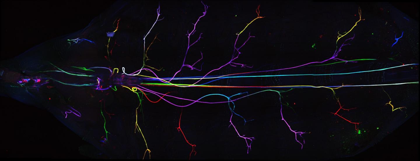 image: Drosophila larva (with the head turned to the left). The surrounding glial cells in the peripheral nervous system have been depicted in individual colours by using a genetic trick. To this end, a random combination of a certain set of fluorescent proteins is induced in the surrounding glial cells by means of a systematic expression of a recombinase so that each cell expresses its own colour code and, as a result, becomes visible under the microscope.