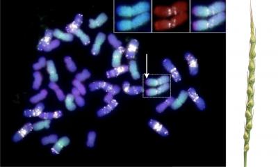 image: At left, a chromosome segment from Aegilops ventricosa, highlighted by the white arrow, is found in the Kansas wheat variety Jagger. This segment carries important genes for pest and disease resistance and is associated with increasing grain yield. Image courtesy of Dal-Hoe Koo. Image right is wild wheat relative Aegilops ventricosa. Image courtesy of Haley Ahlers.