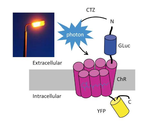 image: Gaussia luciferase (Gluc) is fused to the ChR protein. ChR can be activated by blue light or by light emitted by Gluc when binding to its substrate coelenterazine (CTZ). YFP = yellow fluorescent protein.