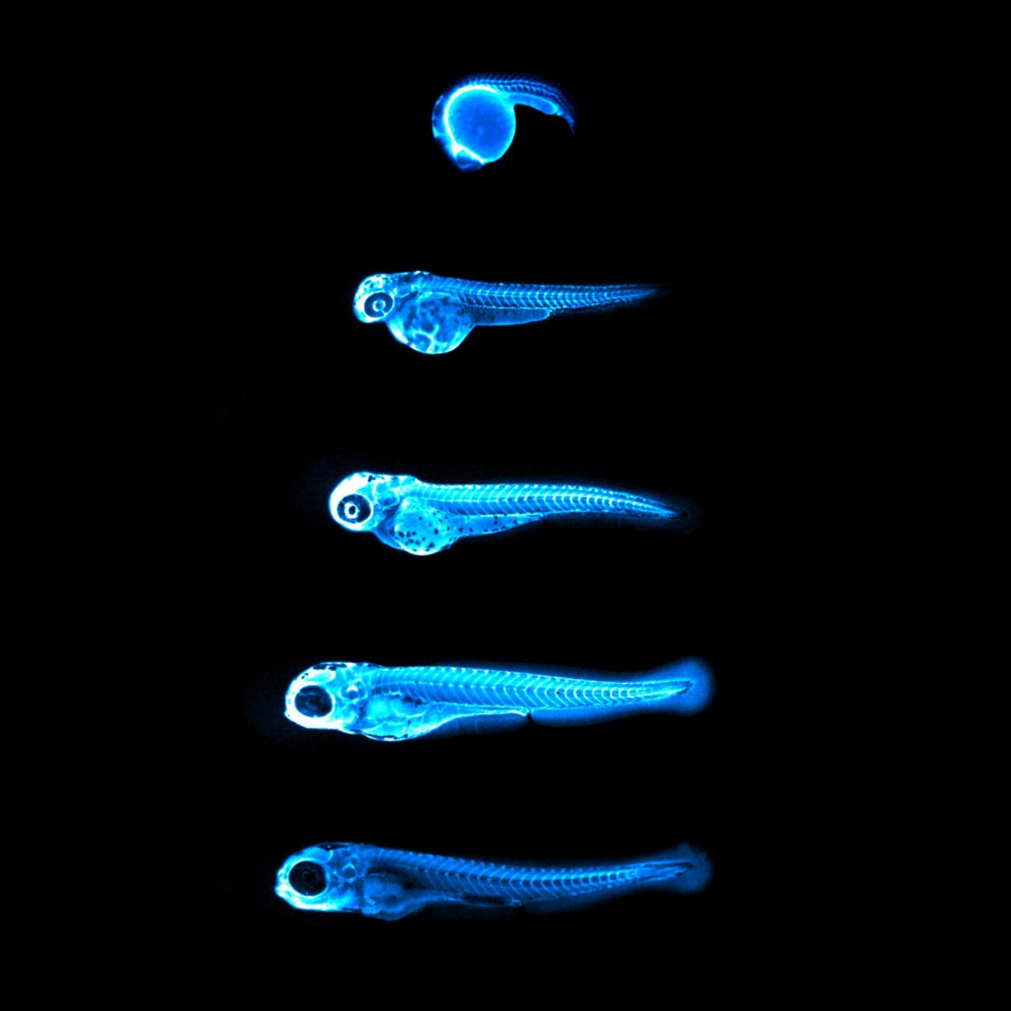 image: This image captures the bright blue light (chemiluminescence) emitted by the NanoLuc protein in LipoGlo zebrafish. By attaching this glowing enzyme to bad-cholesterol particles, researchers are able to visualize how much cholesterol is present in each fish, and where in the body it resides. The top image shows a zebrafish embryo 24 hours into development, with many cholesterol particles emanating from its large spherical yolk. Subsequent images were taken every 24 hours, showing that cholesterol levels peak between three and four days of age in zebrafish embryos.