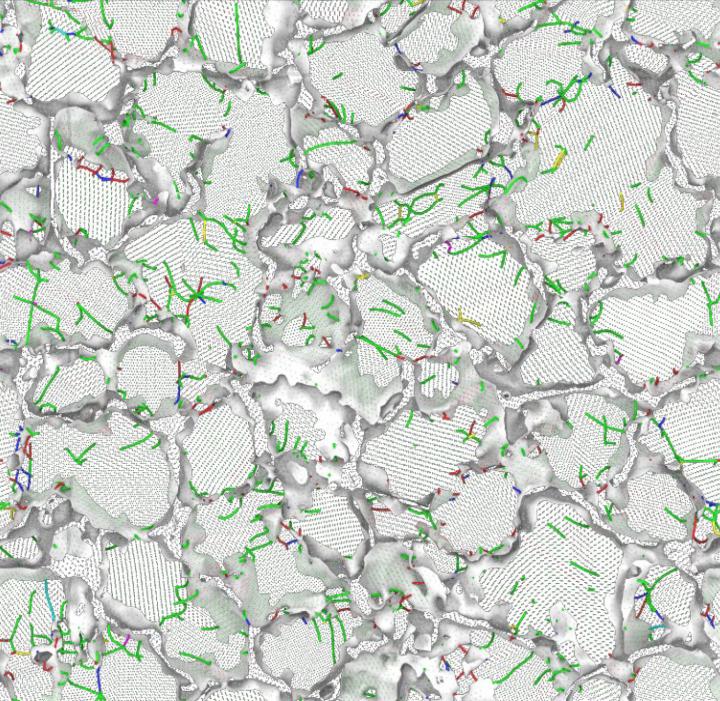 image: A simulation of 3-nm-grain-sized nickel under strain. Colored lines indicate partial or full grain dislocation.