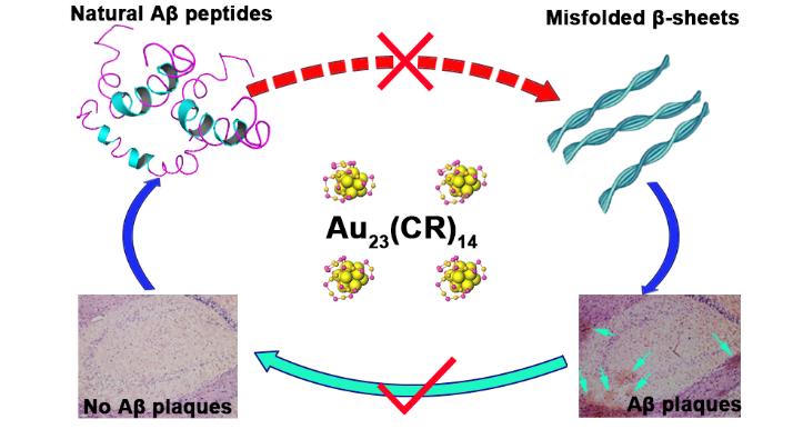 As illustrated in Figure 1, Au23(CR)14, a novel gold nanocluster modified with Cys-Arg (CR) dipeptide, functions in multiple stages of the progression from Aβ monomer to Aβ plaques: inhibiting the misfolding and fibrillation of amyloid-β (Aβ), fully dissolving the preformed/mature Aβ fibrils and restoring the conformation of Aβ peptides from misfolded β-sheets into unfolded monomer state with abolished cytotoxicity, and more importantly, completely dissolving endogenous Aβ plaques in the brain slices from transgenic AD model mice. Furthermore, Au23(CR)14 has good biocompatibility and infiltration ability across the blood brain barrier (BBB).