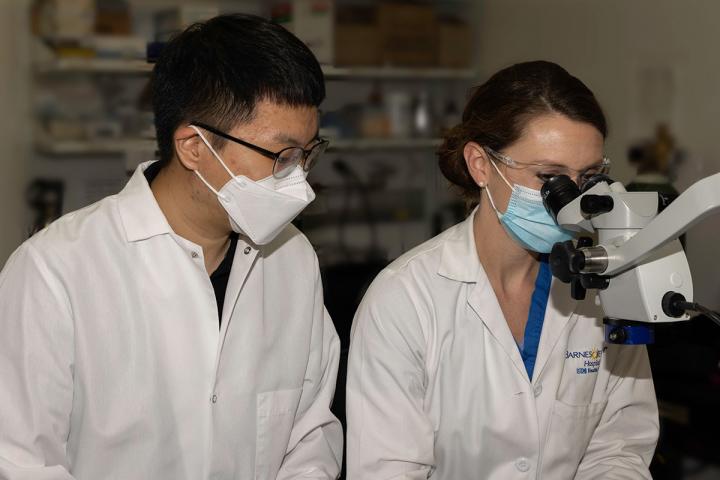 image: A new study from Washington University School of Medicine in St. Louis shows that a type of "good cholesterol" called HDL3, when produced in the intestine, protects the liver from inflammation and injury. First author Yong-Hyun Han, PhD, (left) and co-author and Washington University surgical resident Emily Onufer, MD, work in the surgical suite where the mouse surgeries were conducted as part of this study. Han did this work while a postdoctoral researcher in the lab of senior author Gwendalyn Randolph, PhD.
