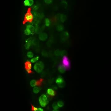 video: Human tumor cells (green) being cleared by macrophages (red) and neutrophils (pink)