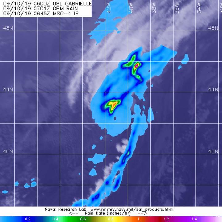 The GPM or Global Precipitation Measurement mission's core satellite passed over Tropical Storm Gabrielle in the eastern North Atlantic Ocean on Sept. 9 at 3:01 a.m. EDT (0701 UTC). GPM found the heaviest rainfall north of the center where it was falling at a rate of over 25 mm (about 1 inch) per hour. GPM is a joint mission between NASA and the Japan Aerospace Exploration Agency, JAXA.