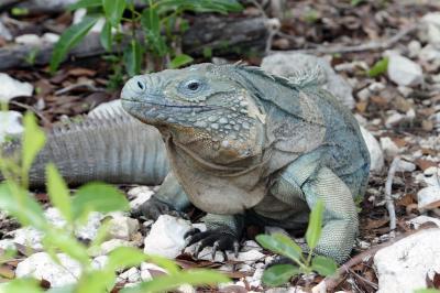 This is an adult Grand Cayman blue iguana on its namesake island. Decimated by a combination of habitat destruction, car-related mortality, and predation by introduced cats and dogs, the reptile numbered between 10-25 individuals by 2002. A recovery program -- assisted by health experts from the Bronx Zoo -- has brought the number of free-ranging iguanas within Grand Cayman's protected areas to more than 500 animals.