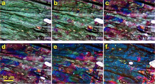 image: Optical micrographs showing transition of stage-2 GIC to stage-1 HOPG GIC. Reflected light. The stage-2 areas are greenish-white. The stage-1 areas are blue. The red-colored areas are the mixed stage. Note, the greenish tint of graphite surface on panels (a,b) is the artifact of the digital processing; the actual color is almost white. The white shapeless feature on the right of the micrographs is an air bubble. Acquired with the SPI-3 HOPG sample.
