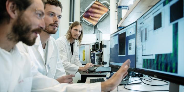 image: Donald Evans, Theodor Holstad and Dennis Meier from the Norwegian University of Science and Technology are working together to create nanoscale networks for the future.