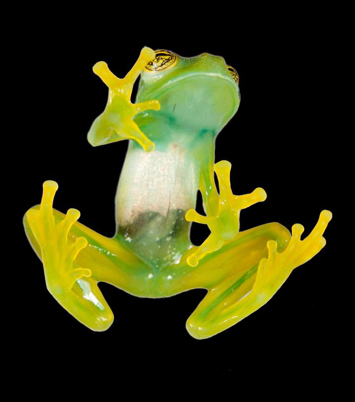 image: The glass frog Espadarana has translucent skin and green insides, thanks to an evolutionary adaptation that turned a toxic byproduct of blood breakdown into a lovely green pigment. Even its bones are green.