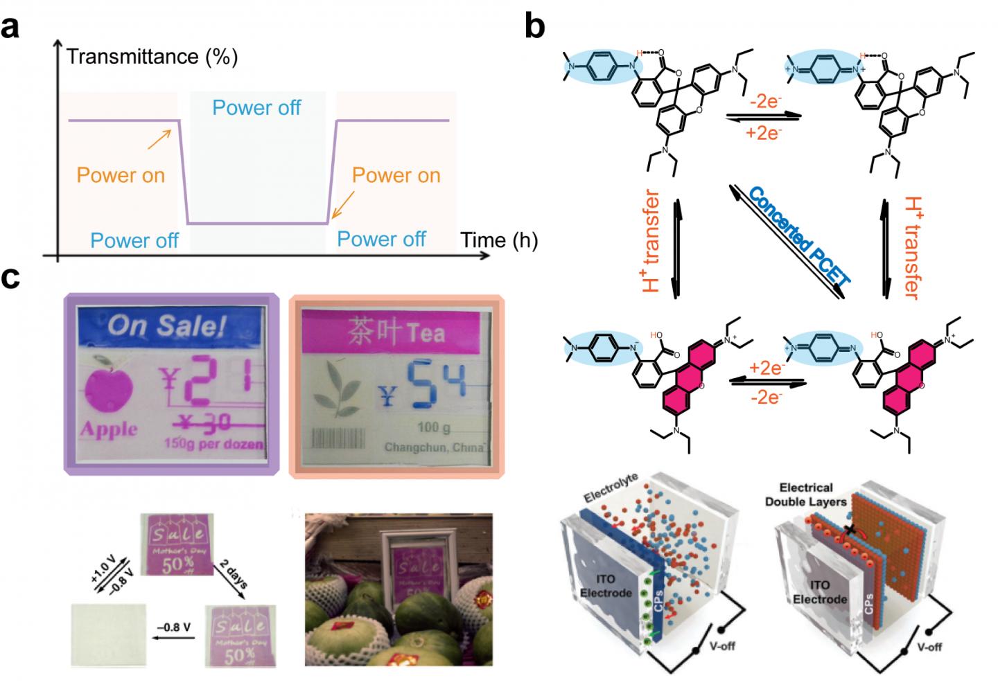 image: a, Optical character of the bistable electrochromic display. b, Bistable electrochromic strategies based on proton coupled electron transfer mechanism, adjusting the interface charge transfer between the polymer and the electrode, and constructing stable electrical double layer. c, Bistable electronic devices applied in shelf label and billboard.