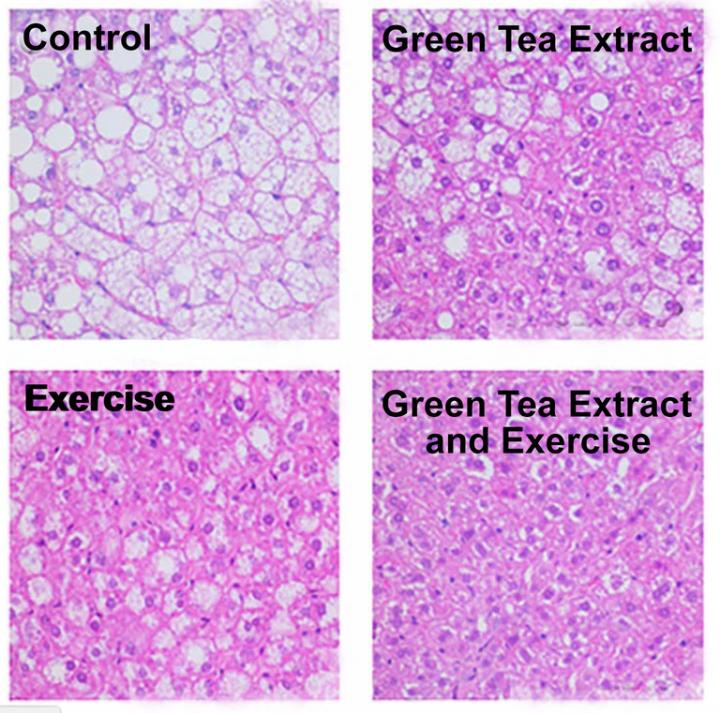 In the study, mice fed a high-fat diet for 16 weeks that consumed green tea extract and exercised regularly by running on a wheel were found to have just a quarter of the lipid deposits in their livers compared to those seen in the livers of a control group of mice. Mice that were treated with green tea extract alone or exercise alone had roughly half as much fat in their livers as the control group.