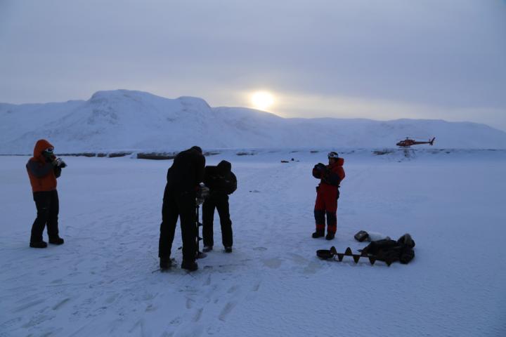 image: An ice auger is used to drill a borehole through the proglacial Isortoq River seasonal ice cover.