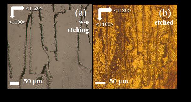 image: In addition to large grooves, which were present before etching, high density of small grooves were observed on the surfaces after etching.