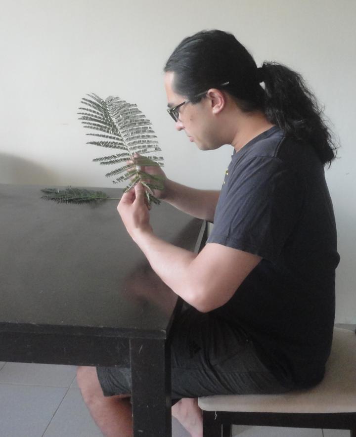 image: University of Guam Research Associate Benjamin Deloso examines a bi-pinnately compound leaf of Guam's flame tree. The endangered Serianthes nelsonii tree makes a leaf that uses this same design.
