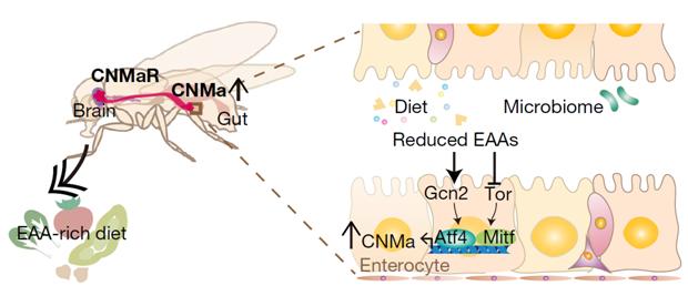 image: Overview of the microbiome-gut-brain axis. CNMa is upregulated by Atf4 and Mitf (and possibly other unknown factors) during the deprivation of essential amino acids, and this acts on CNMaR-expressing neurons to stimulate the compensatory appetite for essential amino acids.