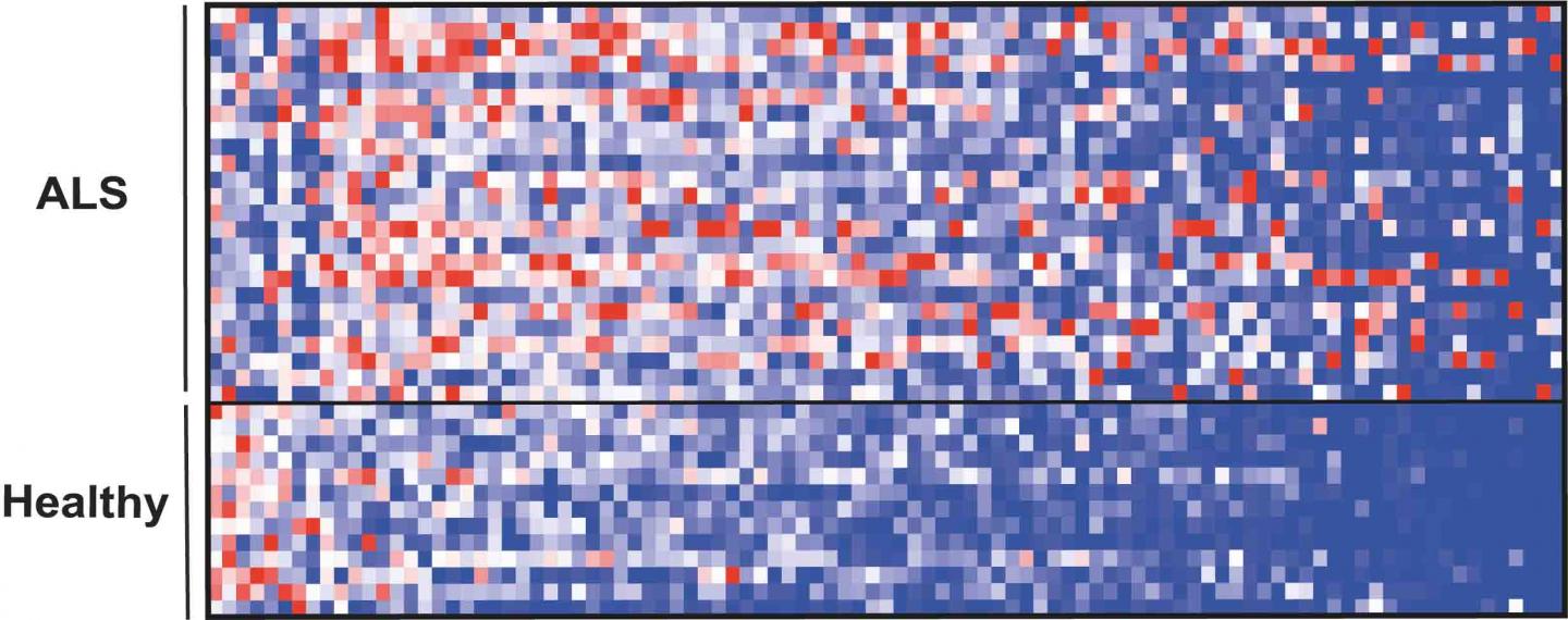 image: The repertoire of small molecules (metabolites) in blood, many of which originate in the microbiome, showed a different pattern in patients with ALS (top) compared with healthy individuals (bottom).