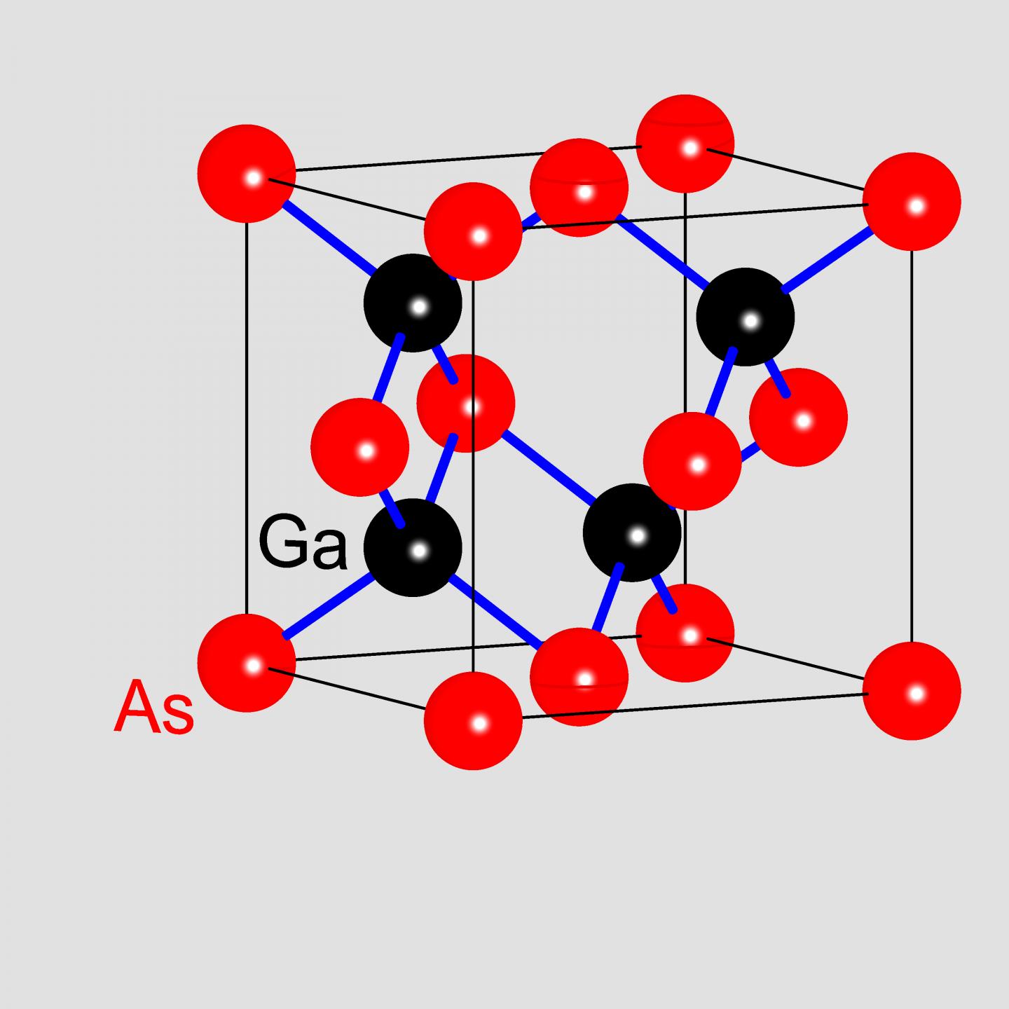 image: Unit cell (a cube having an edge length of 0.56 nm [one millionth of 0.56 mm]) of gallium arsenide with gallium (black) and arsenic atoms (red) connected by covalent bonds (blue). A gallium arsenide crystal consists of many billions of such unit cells.