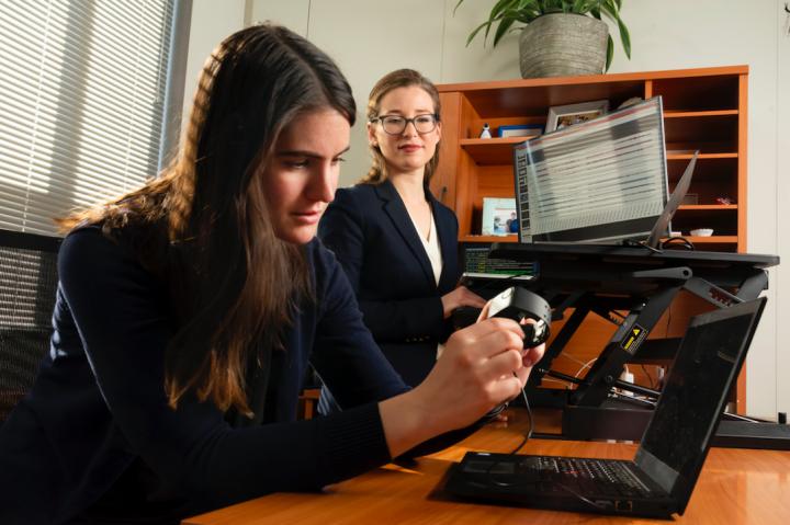 image: Ph.D. student Brinnae Bent prepares to download information from a wearable health monitoring device while assistant professor Jessilyn Dunn looks on.