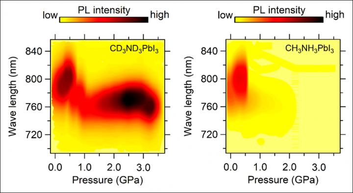 image: Color plots of the pressure-dependent PL evolutions of CD3ND3PbI3 (left) and CH3NH3PbI3 (right) single crystals.