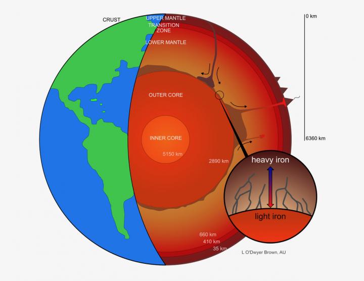 image: Earth's molten core may be leaking iron, according to researchers at UC Davis and Aarhus University, Denmark. The new study suggests heavier iron isotopes migrate toward lower temperatures -- and into the mantle -- while lighter iron isotopes circulate back down into the core. This effect could cause core material infiltrating the lowermost mantle to be enriched in heavy iron isotopes.