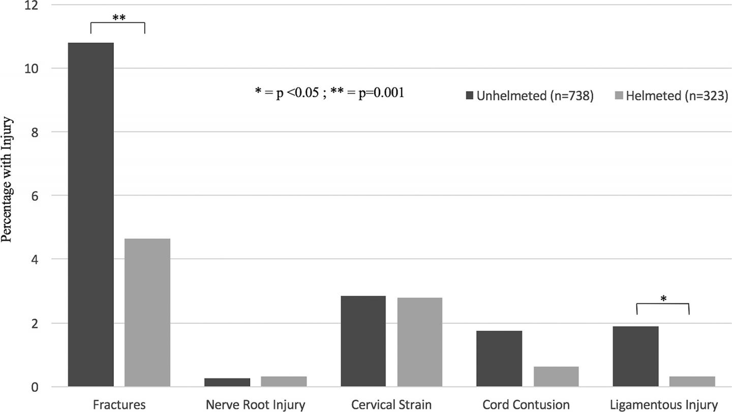 image: This is a bar graph showing the characterization and distribution of cervical spine injuries in helmeted & unhelmeted riders after motorcycle crashes.