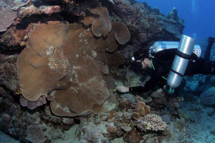 image: Researcher Norbert Englebert collects samples from a Pachyseris speciosa colony.