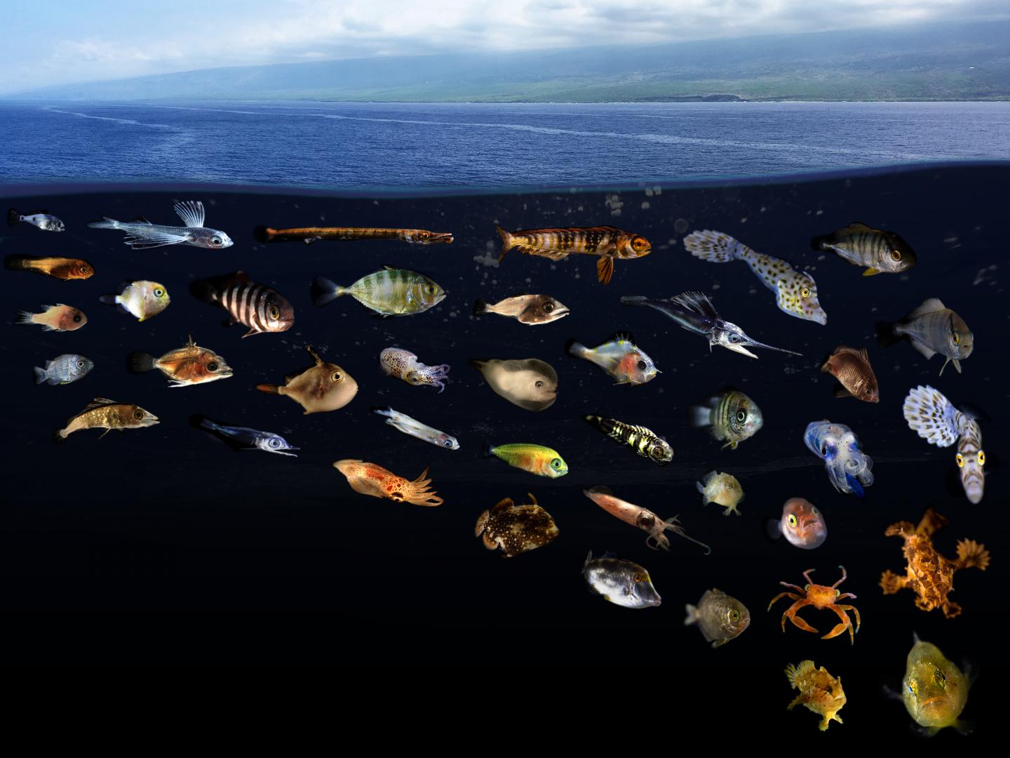 image: Composite image showing just a small portion of the remarkable diversity of larval and juvenile fishes and invertebrates found living in surface slick nurseries along West Hawaii Island.
