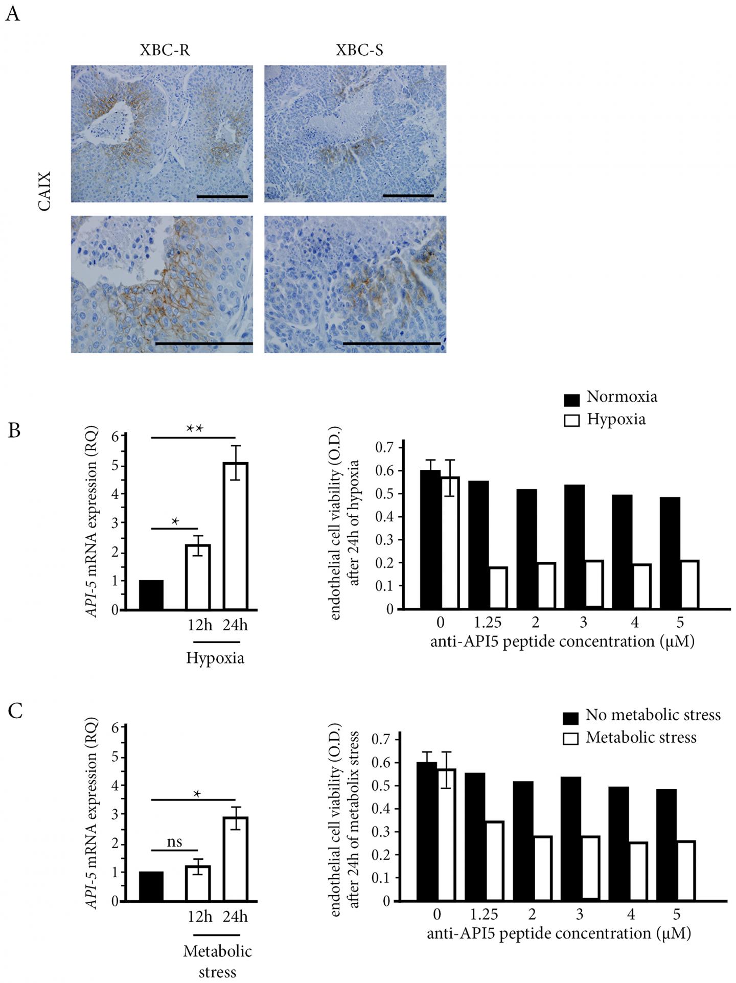 image: The influence of stress conditions on API-5 expression and inhibition. (A) Hypoxia CAIX immunostaining on XBC-R and XBC-S (n = 5 for each). CAIX labelling and necrotic areas were detected at a magnification of 200 (top panel) and 400 (bottom panel). (B, C) API-5 expression in HMEC cells and the effect of anti-API-5 peptide under hypoxia and metabolic stress conditions respectively. API-5 expression showed an increase after 12 h and 24 h of hypoxia and metabolic stress respectively. The effect of anti-API-5 peptide was more efficient under stress conditions on HMEC cell viability.