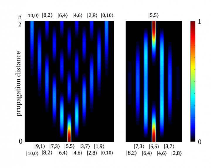 image: Discrete diffraction and Bloch oscillations in abstract Fock-space that emerge from a simple two-waveguide beam splitter system excited by the ten-photon state.