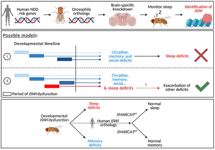 After observing the flies' behavioral patterns, they saw that knocking down the gene Imitation SWItch/SNF (ISWI) made the fruit flies almost entirely unable to sleep. ISWI in fruit flies is homologous to SMARCA1 and SMARCA5 genes in humans that have been linked to various neurodevelopmental disorders. In addition to sleep deficits, the researchers found that knocking down ISWI also led to memory problems and social dysfunction. Surprisingly, the ISWI gene was found to act in different cells of the fly brain during distinct developmental times to independently affect each of these behaviors.