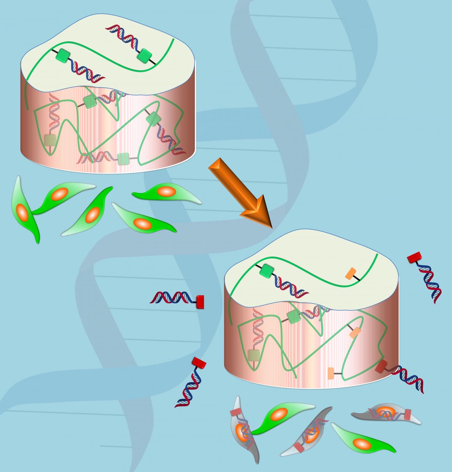 Alsberg together with Matthew Levy, associate professor of biochemistry at Albert Einstein College of Medicine, and their colleagues developed a unique hydrogel strategy that allows for more control over the release of siRNAs over time. By chemically coupling the siRNA to the hydrogel via a linker that can degrade in the body, they can control the release of the drug. When the hydrogel is placed in a water-based environment, such as a biological organism, water breaks the linker between the siRNA and the hydrogel, releasing the drug. In this kind of system, release of the drug is prolonged compared with when the siRNA is only physically trapped within the hydrogel.