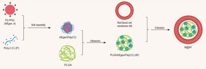 Recently, Shixuan Wang from Huazhong University of Science and Technology of China, Fan Xia from the China University of Geosciences and Yuning Hong the La Trobe University of Australia reported the preparation of NPs that comprise an AIE-conjugated polymer as a photosensitizer and Poly(I : C) as an immunologic adjuvant, a PLGA matrix and an red blood cell (RBC) membrane shell, which provide a novel strategy for tumor treatment.