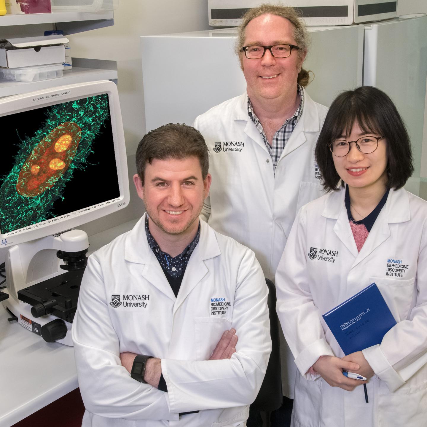 image: This photo shows Dr. Gregory Moseley with Dr. Stephen Rawlinson and Tianyue Zhao.