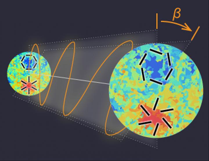 image: As the light of the cosmic microwave background emitted 13.8 billion years ago (left image) travels through the Universe until observed on Earth (right image), the direction in which the electromagnetic wave oscillates (orange line) is rotated by an angle β. The rotation could be caused by dark matter or dark energy interacting with the light of the cosmic microwave background, which changes the patterns of polarization (black lines inside the images). The red and blue regions in the images show hot and cold regions of the cosmic microwave background, respectively.