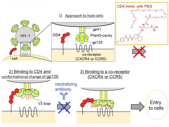 image: The V3 loop of an HIV envelope protein gp120 is exposed by the conformational change of 2). A CD4 mimic with PEG blocks the progress from 1) to 2) (the first arrow), and a neutralizing antibody blocks the progress from 2) to 3) (the second arrow). Without these drugs, HIV enters cells.