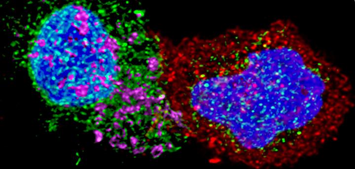 image: CD8 lymphocytes (red) of HIV controller patients in contact with CD4 cells (green) infected with HIV. The cell nuclei are in blue. In pink, a cytotoxic molecule secreted by CD8 cells to destroy CD4 cells.