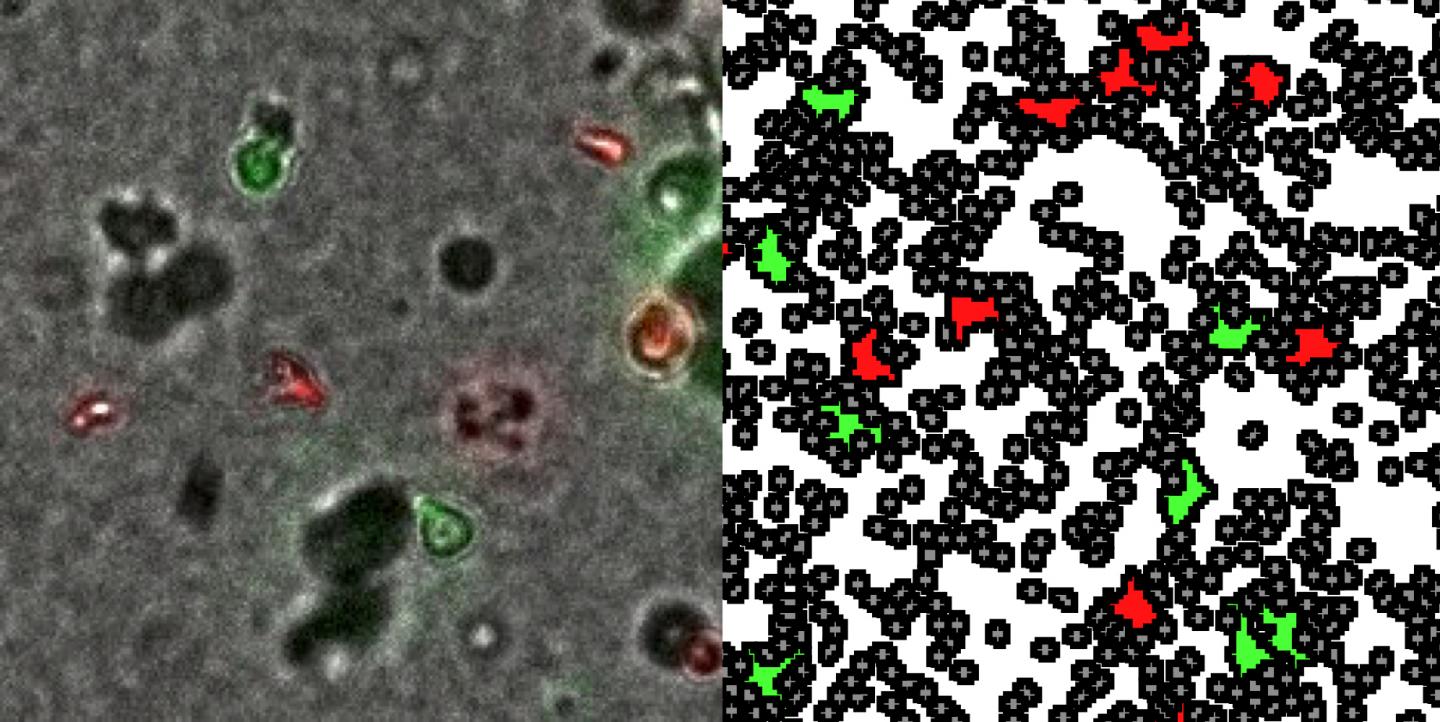 image:Â Microscopic recording and computer model of the interaction between infected cells (green) and non-infected cells (red) in collagen structures (grey).