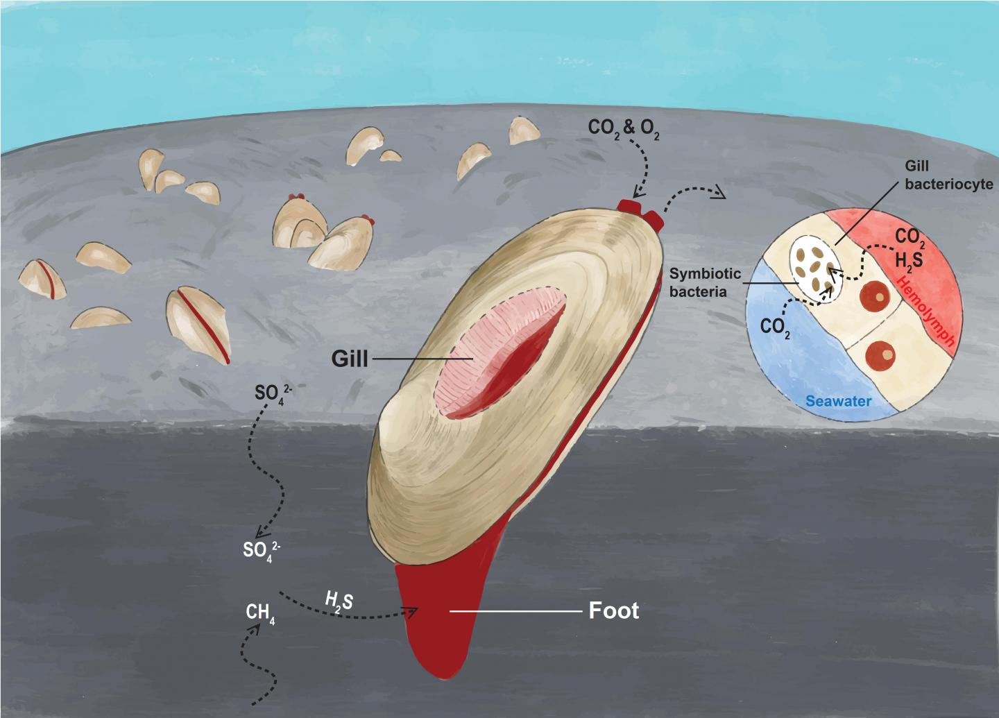 Due to the general lack of photosynthesis-derived organic matter, the deep-sea was once considered a vast "desert" with very little biomass. Yet, clams often form large populations in the high-temperature hydrothermal vents and freezing cold seeps in the deep oceans around the globe where sunlight cannot penetrate but toxic molecules, such as hydrogen sulfide, are available below the seabed. The clams are known to have a reduced gut and digestive system, and they rely on endosymbiotic bacteria to generate energy in a process called chemosynthesis. However, when this symbiotic relationship developed, and how the clams and chemoautotrophic bacteria interact, remain largely unclear.