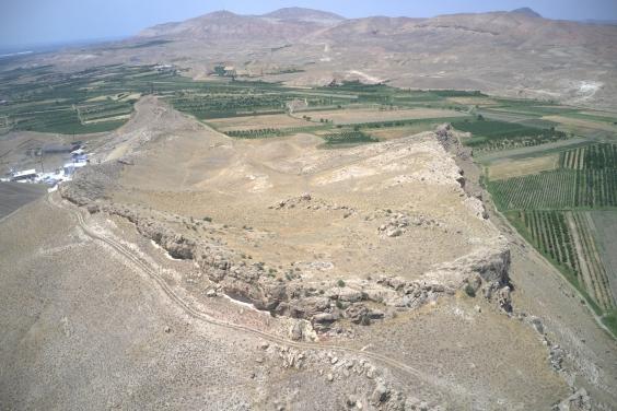 image: This drone photograph faces northwest over the Vedi Fortress site. Cliffs surround and protect much of the site, with two lines of fortress walls protecting the western approach to the citadel.
