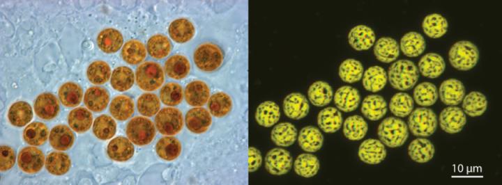 image: Light and confocal images of Symbiodinium cells living in a host cell.