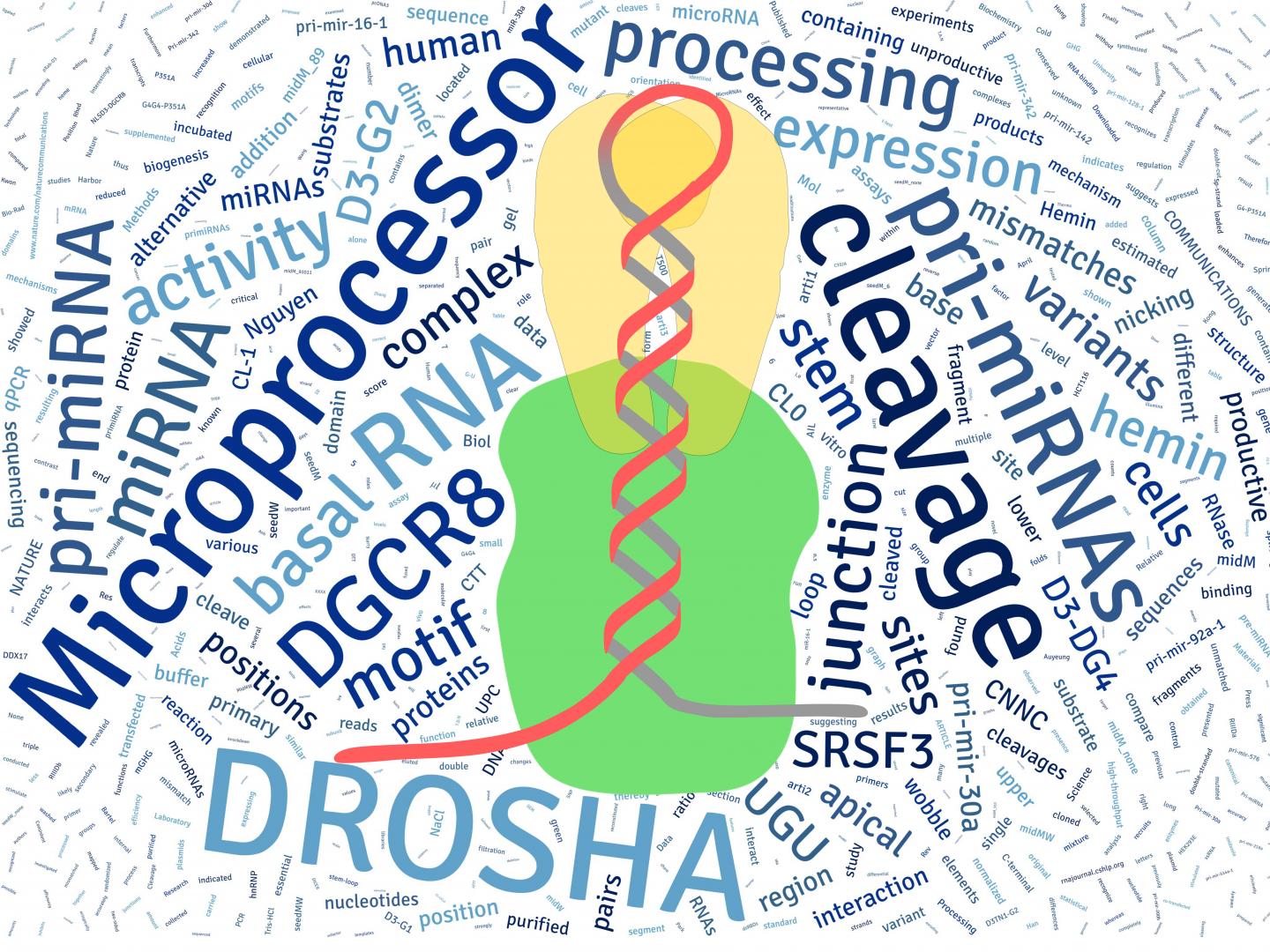 image: The model of Microprocessor on pri-miRNA. Pri-miRNA is illustrated with ribbons. Microprocessor is a trimeric complex, consisting of DROSHA (green) and DGCR8 dimer (yellow). The background is the word cloud generated using our lab's publications since 2018.