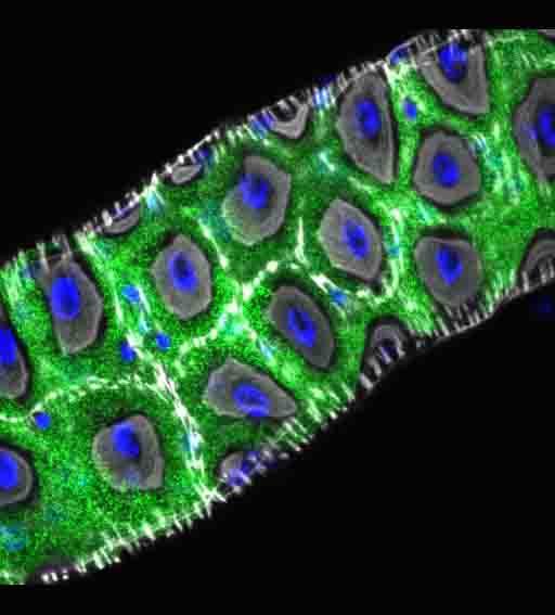 image: This image shows the segment of the Drosophila intestine where the Hodor zinc sensor is found. All cell nuclei are labelled in blue with a DAPI stain, and visceral muscle are highlighted in white with phalloidin. The subset of cells that express Hodor are labelled in green.