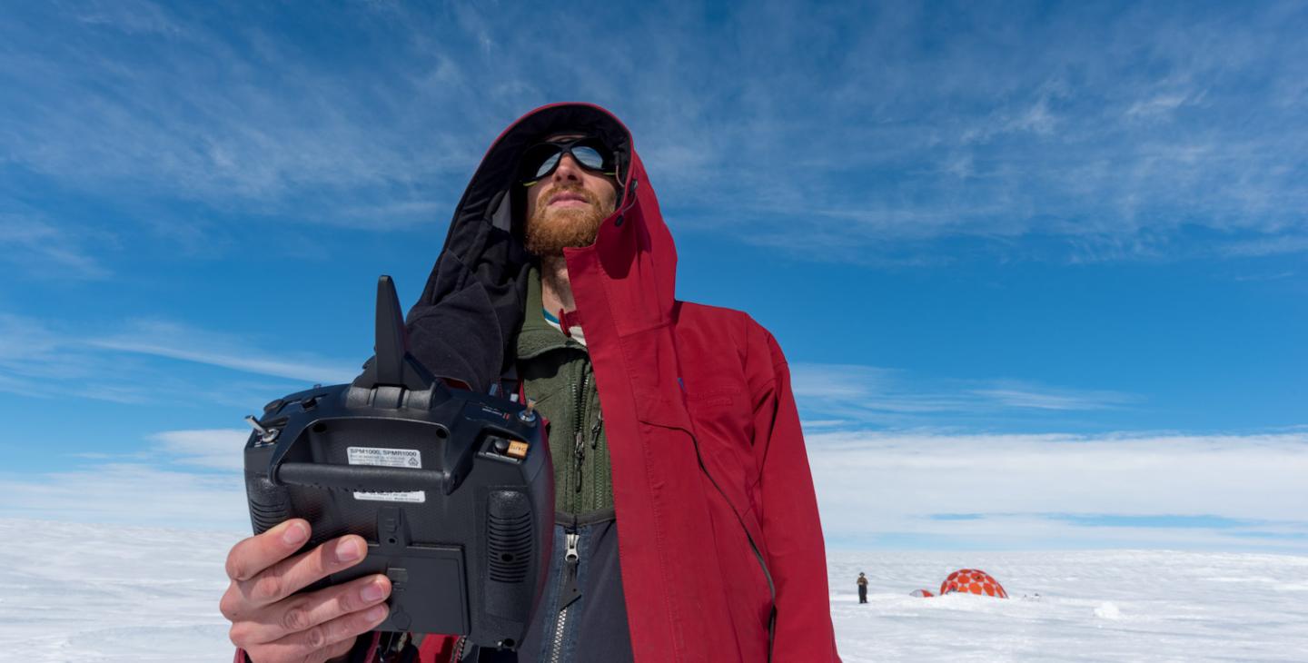 image: University of Arkansas geosciences associate professor Matt Covington flies a drone on the Greenland ice sheet.