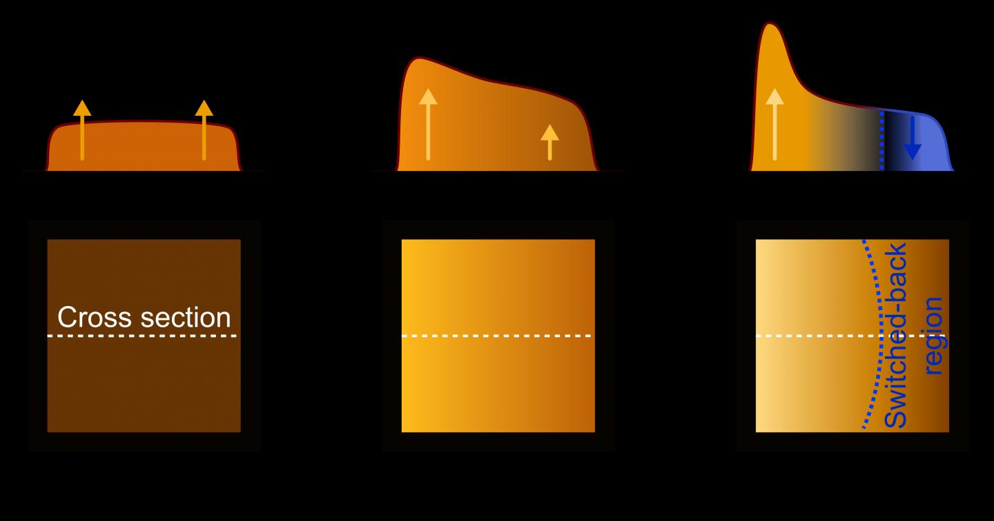 image: Proof of switched-back regions by detecting luminance changes in OLEDs: The bottom line of the figure presents the top-view sketches onto an OLED pixel at three different exemplary stages of total applied current. The top-line estimates the luminance profiles across the indicated cross section. While low driving currents result in a homogenous luminance distribution (left column), elevated currents give rise to a gradually decreasing luminance profile (middle column). After exceeding a certain threshold current, the luminance will even reduce ("switch back") in certain areas of the device (right column).