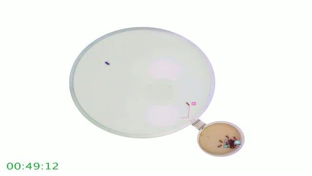 video: Here, in a colony of 25 individually-tagged ants, a scout leaves the nest in search of prey [a fire ant pupa, dyed blue]. After she locates it, she lays pheromone trail home and recruits a raiding column of her nestmates for a collective attack.