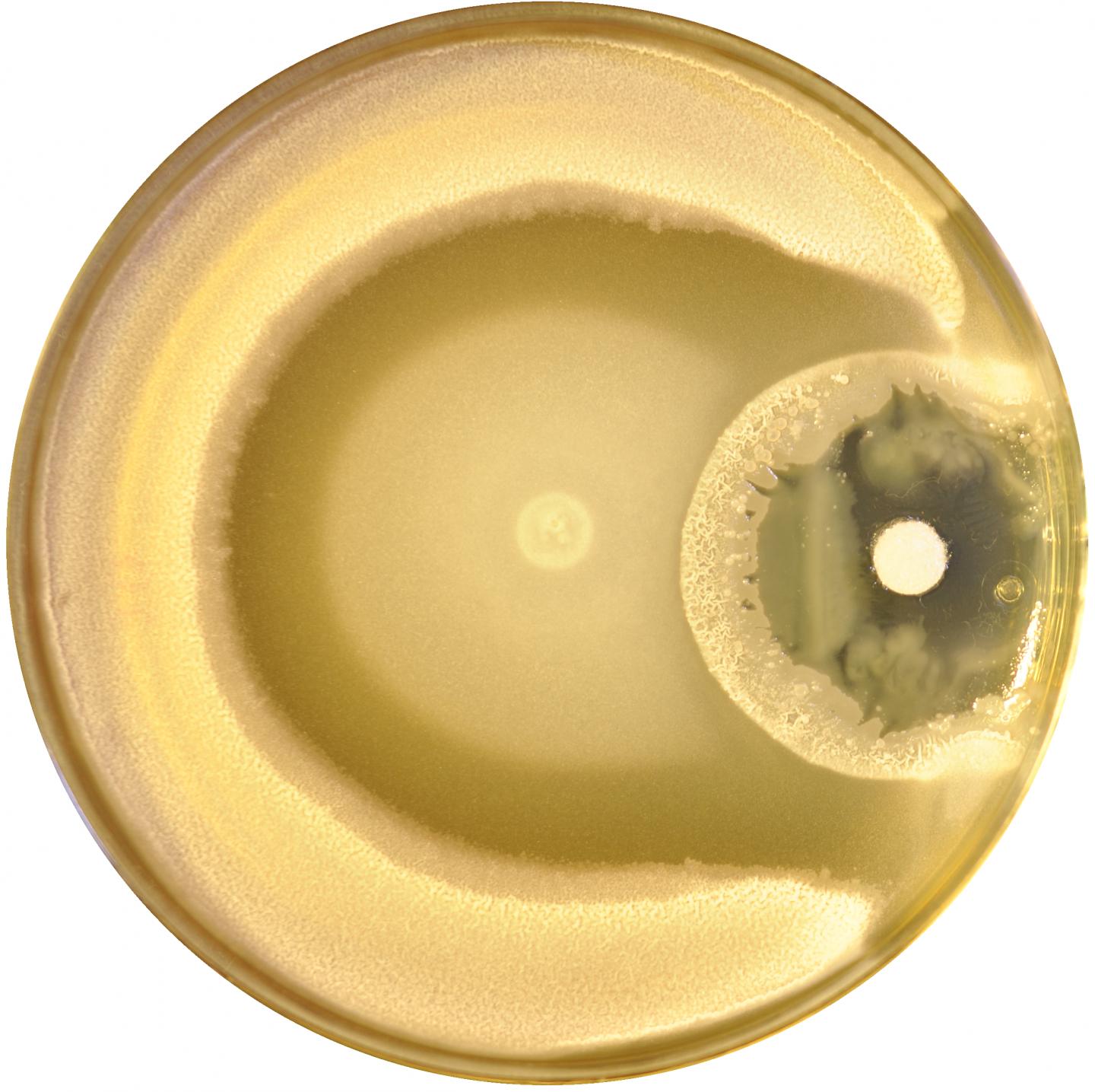 image: Swarming Bacillus subtilis cells form a multilayered biofilm in a dish when exposed to the antibiotic kanamycin (pictured here on the right-hand side of the dish)