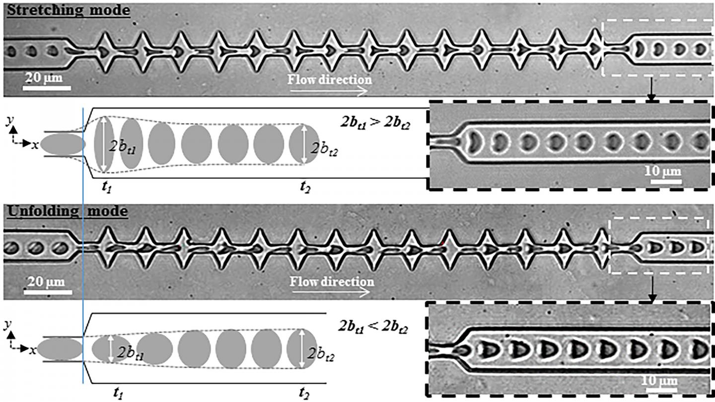 WASHINGTON, April 28, 2020 -- Laboratory blood tests are often done by forcing samples through small channels. When the channels are very small, as in microfluidic devices, red blood cells (RBCs) are deformed and then relax back to their original shape after exiting the channel. The way the deformation and relaxation occur depends on both the flow characteristics and mechanical properties of the cell's outer membrane.
