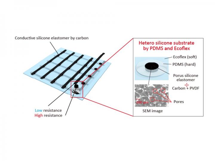 "In addition, resistances of column and row electrodes in the matrix of the mapped array are much lower than the ones of the pressure sensors," Ota said. "This substrate and control of electrode resistances can prevent stretch deformation of the device from affecting the sensing of pressure."